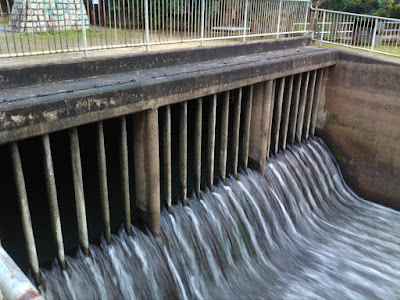 來至大欖涌水塘,雨勢稍停,這是東江水的入口處,並立碑著名,但睇極都唔明,點解個鐵板碑文要用鐵絲網包到實,莫非驚人破壞?